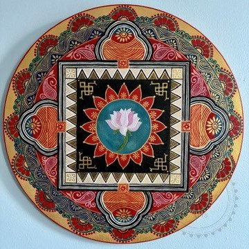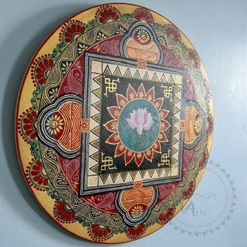 Ananta means infinite or unending. Mandala in bright colours with fine details in metallic gold. Lotus in the centre represents the act of rising above all desires and attachments- the key to spiritual enlightenment.