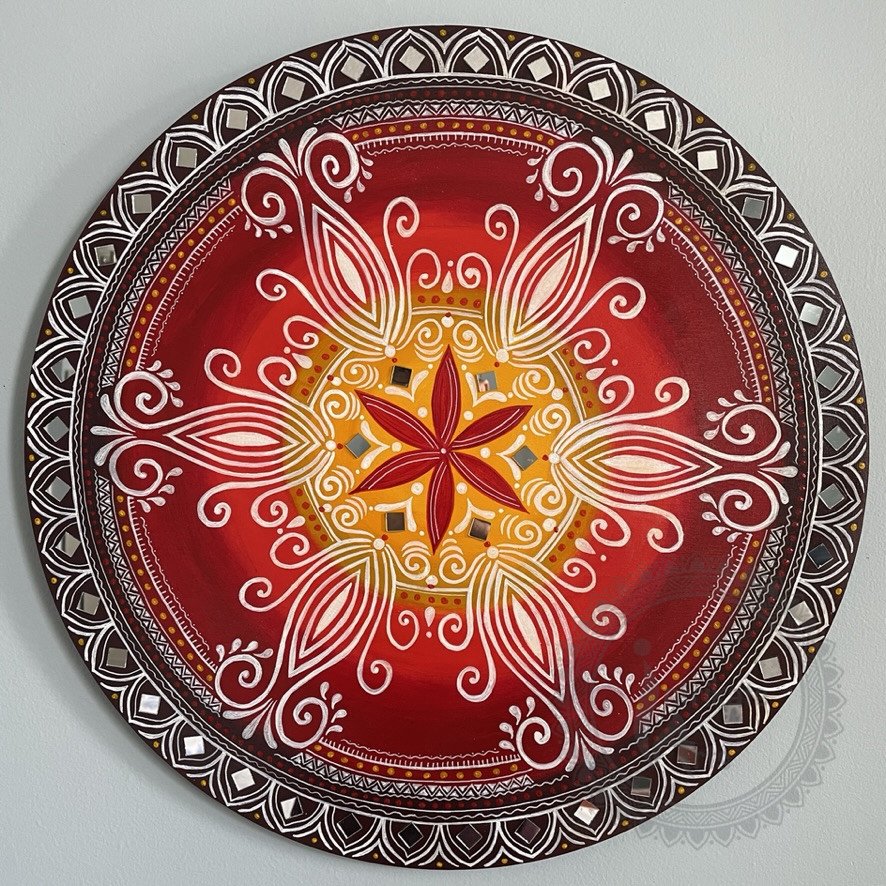 Bright and bold, hand painted and embellished with tiny mirrors for that bling factor. Use as decoration for festivals like Durga puja, Navratri, Karva Chauth, and Diwali.