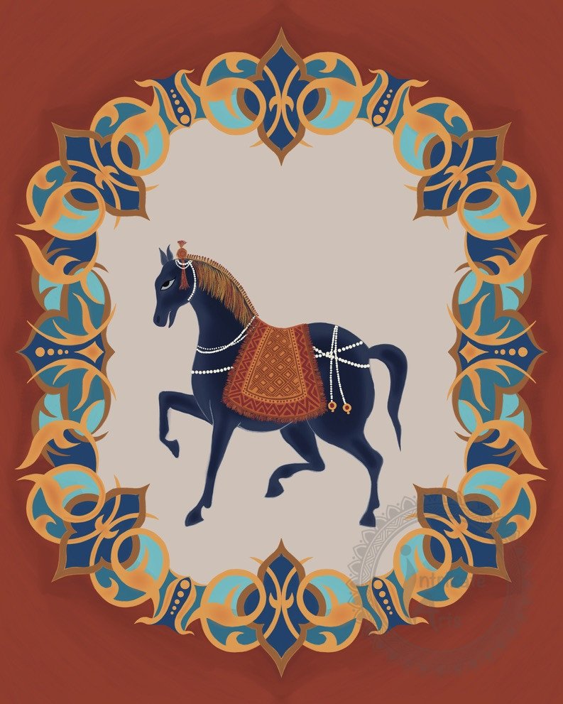 This artwork draws inspiration from traditional motifs and folkloric charm – a tribute to the artistry of Indian miniature painting, with a touch of whimsy.
