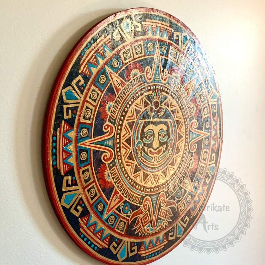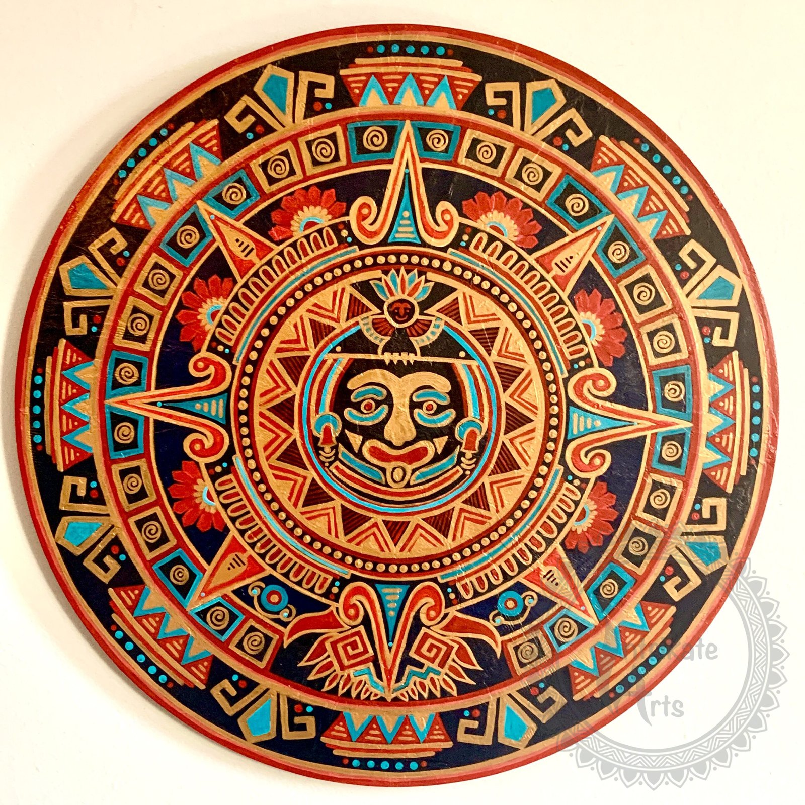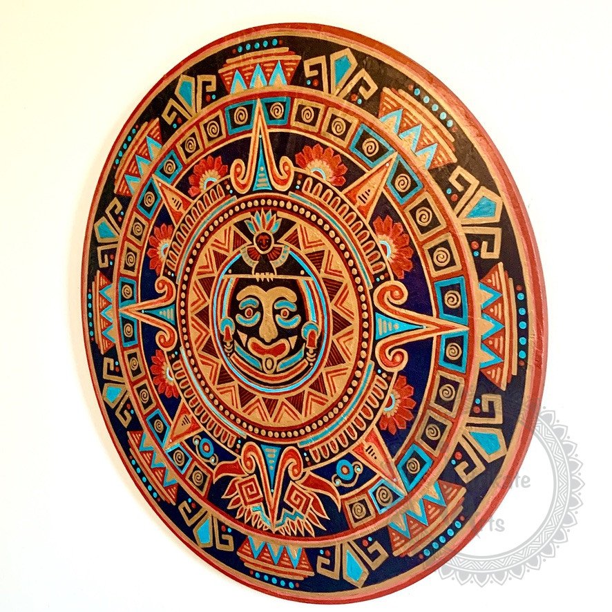 Tonatiuh, a tribute to the life-giving force of the sun, is inspired by the elements of Aztek calendar and colours of the traditional Tibetan jewellery. This mixed media mandala combines bold, tribal shapes with the radiant face of the Aztec sun deity, Tonatiuh, at its center. The carefully chosen colors of coral, turquoise, and antique gold evoke a sense of prosperity and vitality. A testament to the enduring power of art to bring people and traditions together.