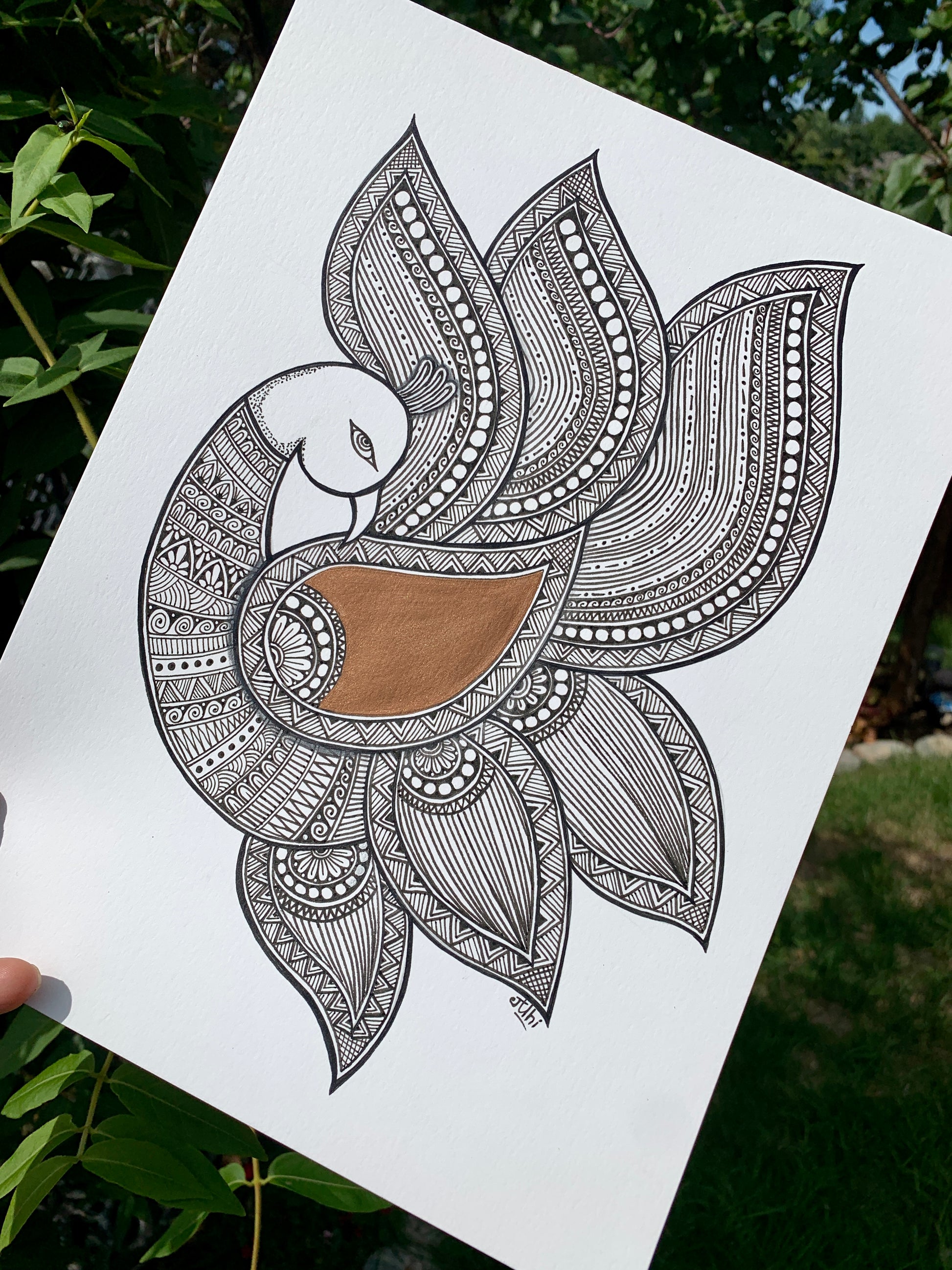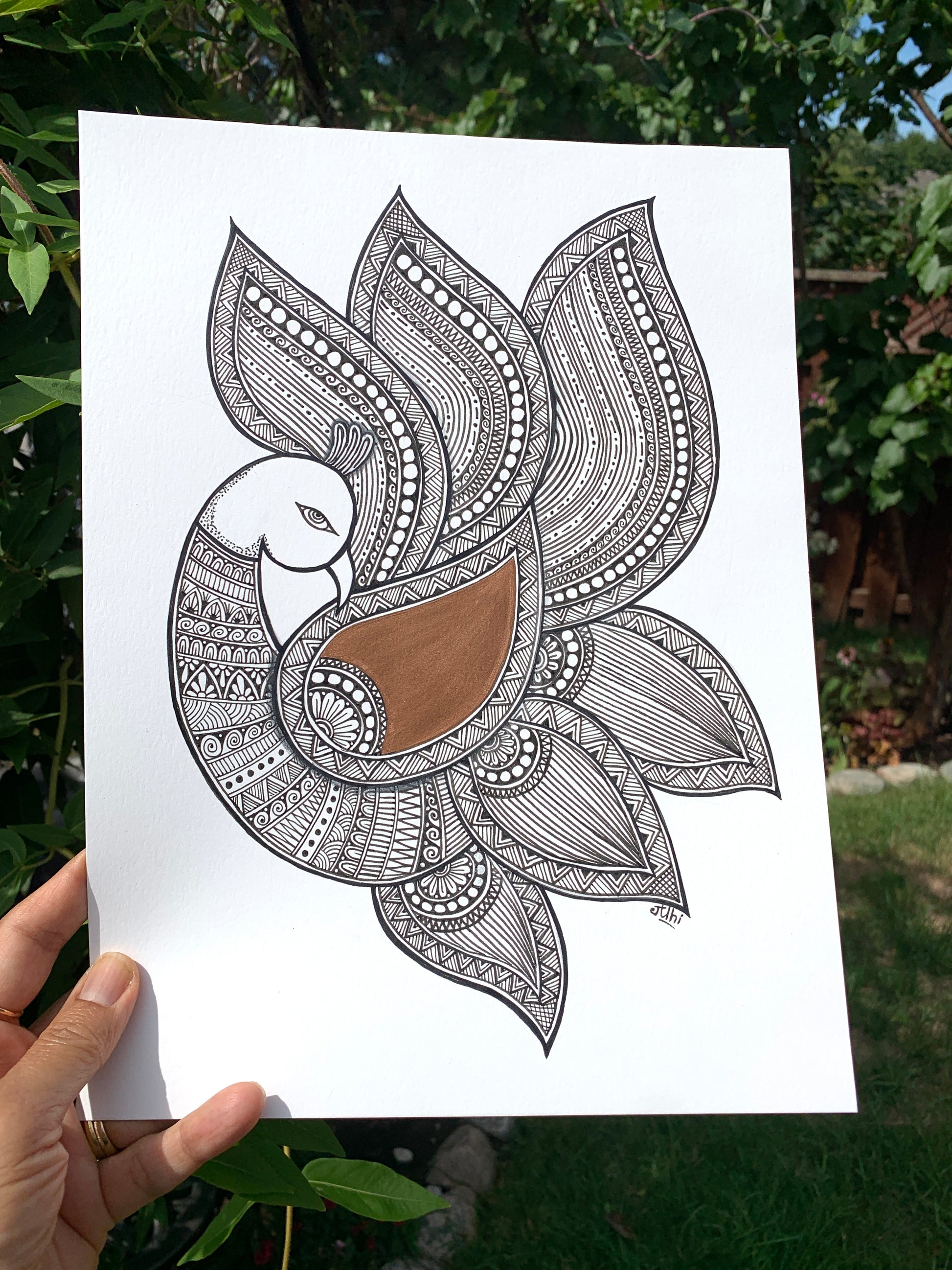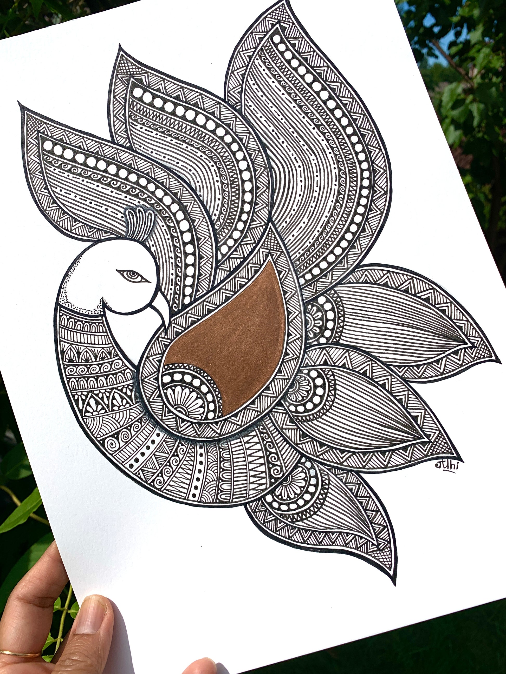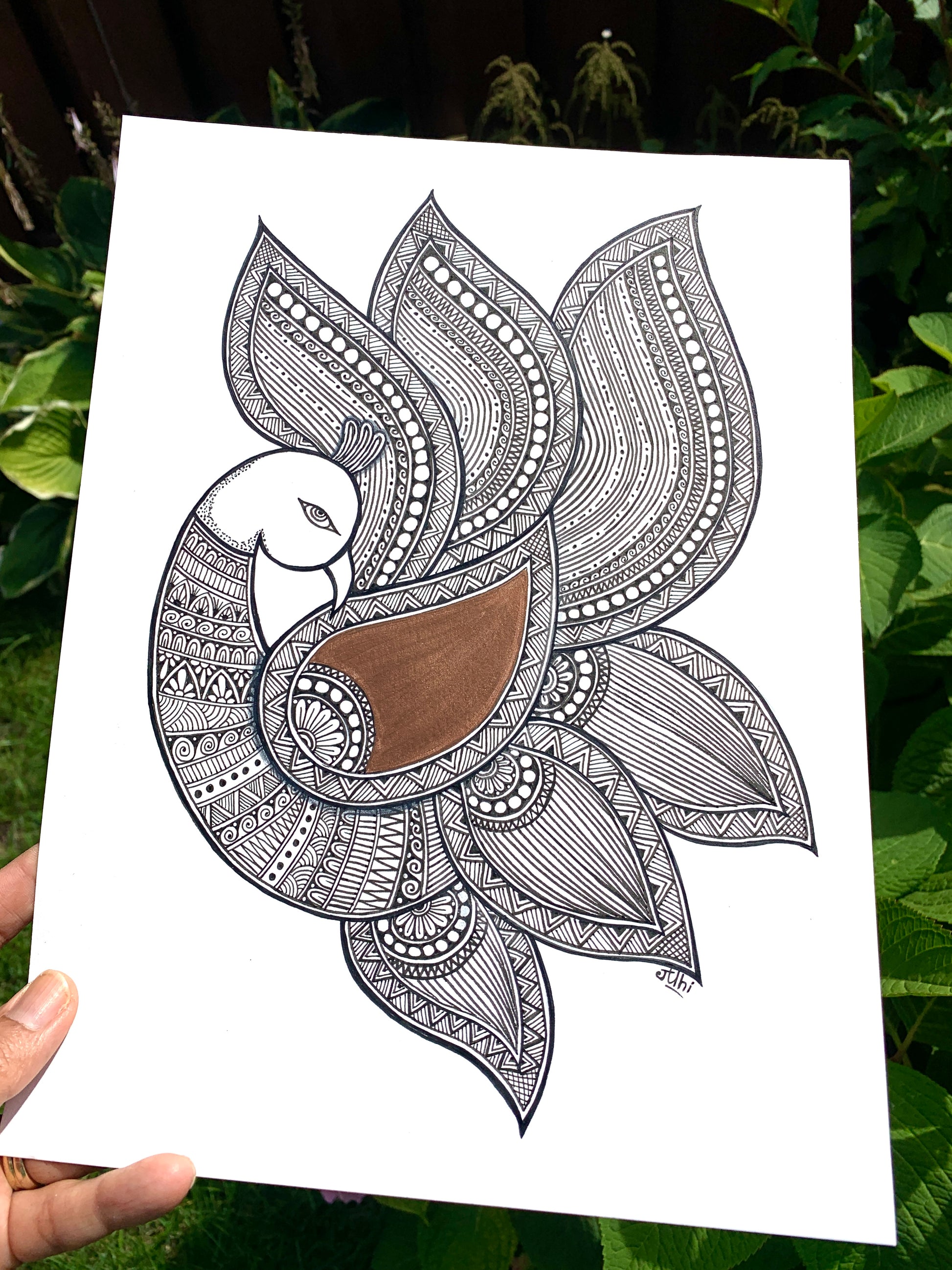 Peacock motifs have always been a favorite for folk artists. Stylization is an integral part of any folk art, adding a charm to the final render.