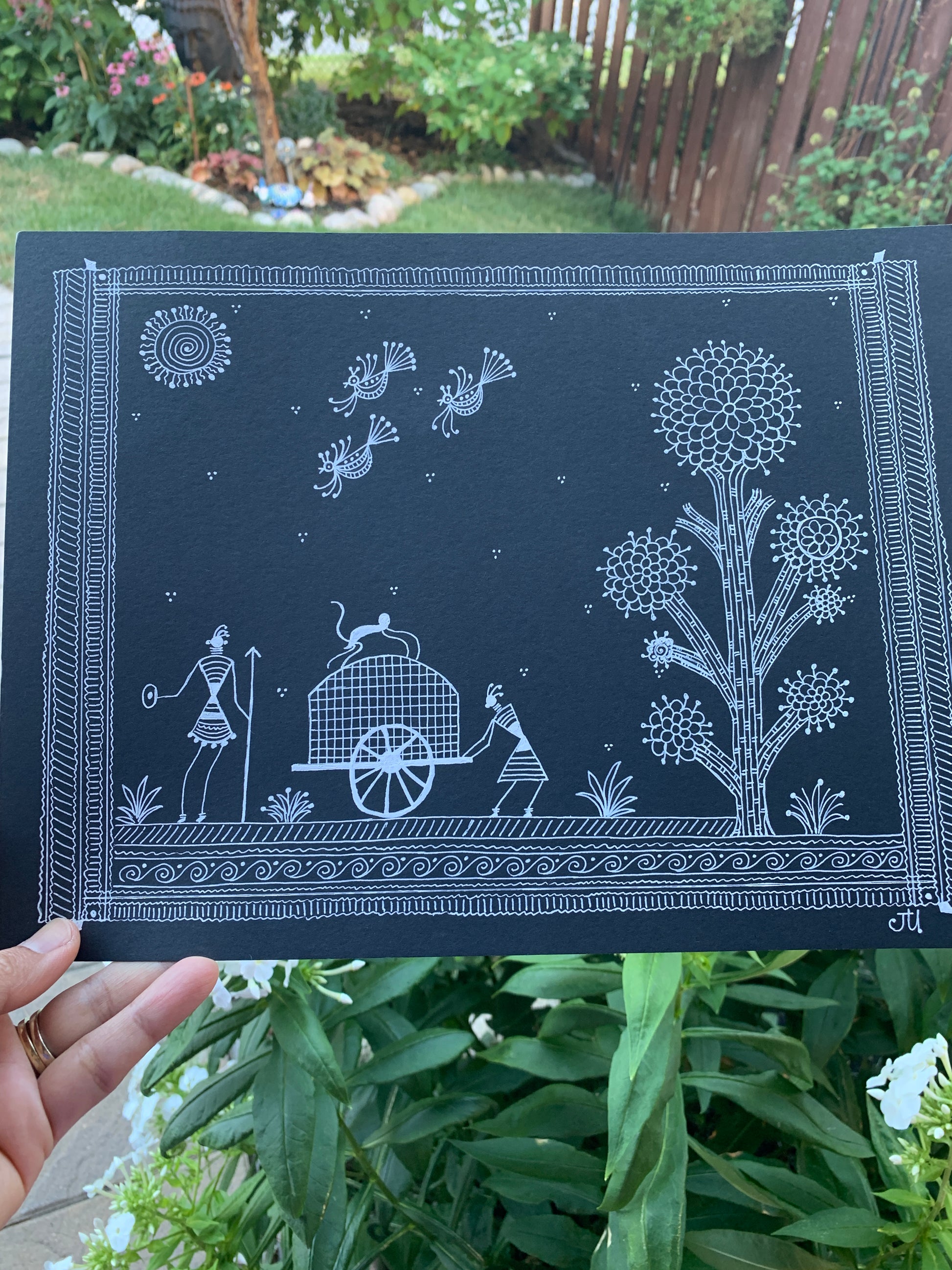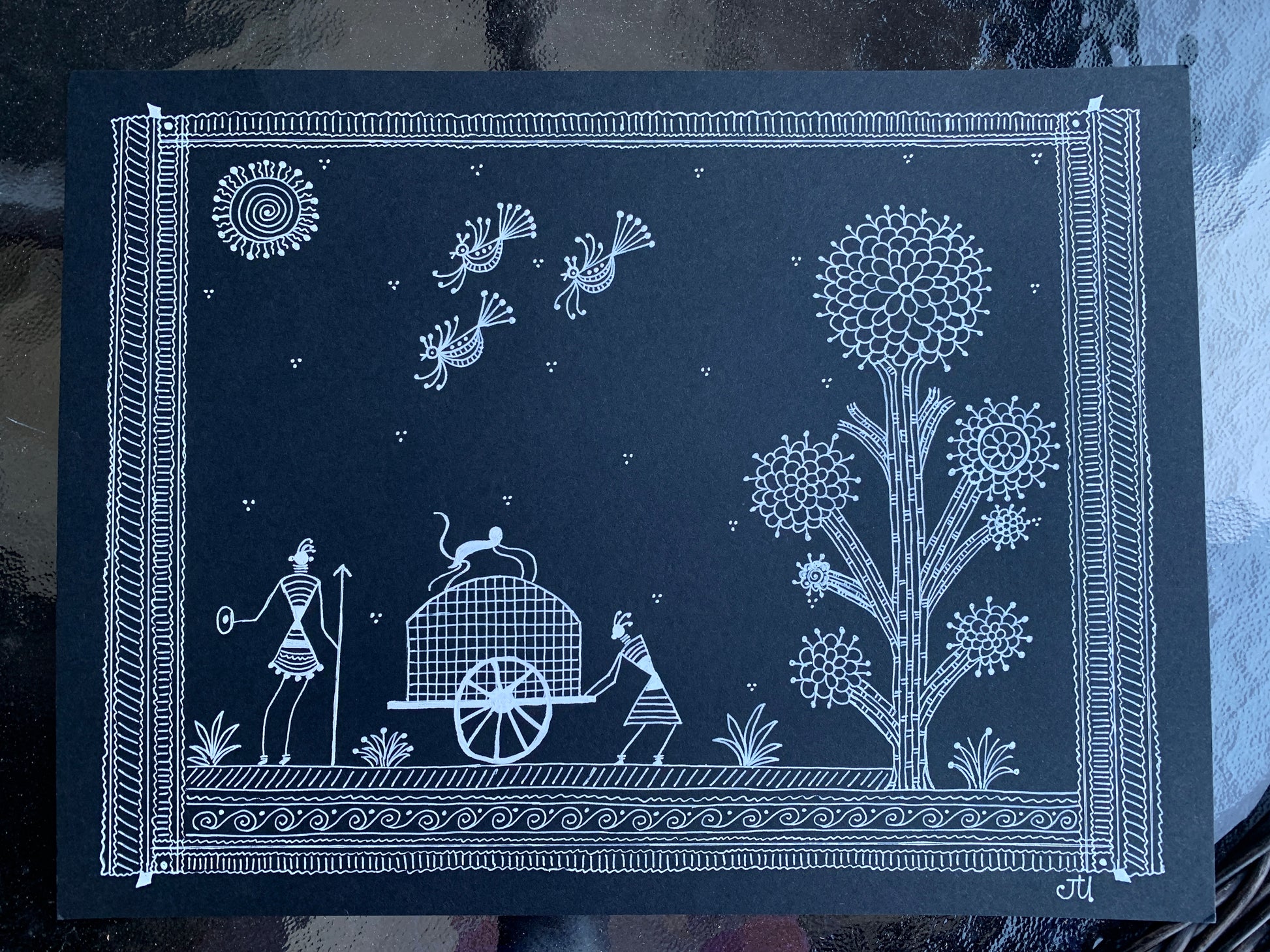 This artwork is created in the style of tribal wall mural art known as the Saura tribal paintings. Associated with the Saura ribals of Odisha, a tribe with distinct culture and a deep connection to nature these wall murals seem to be a simplistic depiction of their day to day life in the village. The human figures are elongated, less angular and almost always encased in an intricate mesh like border.
